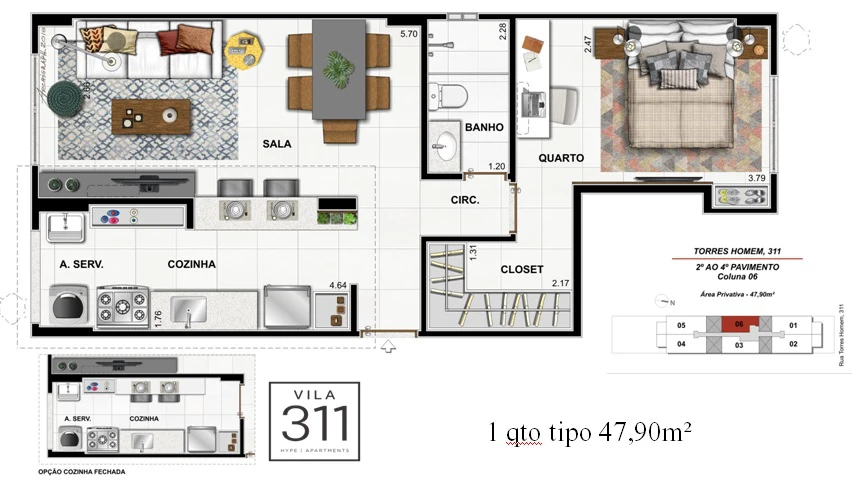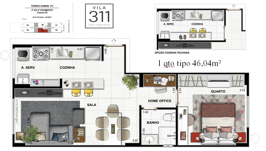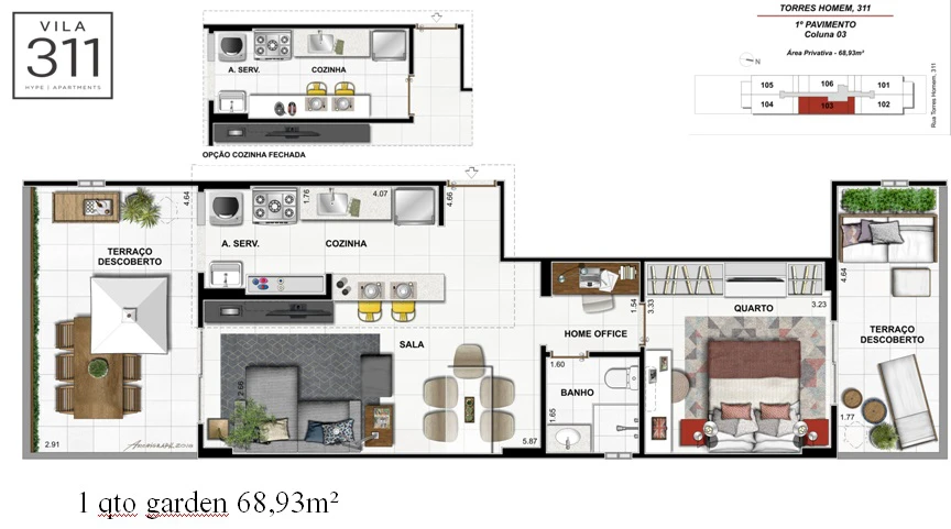 Apartamentos Garden de 1 quarto com 68m² até 71m²;
